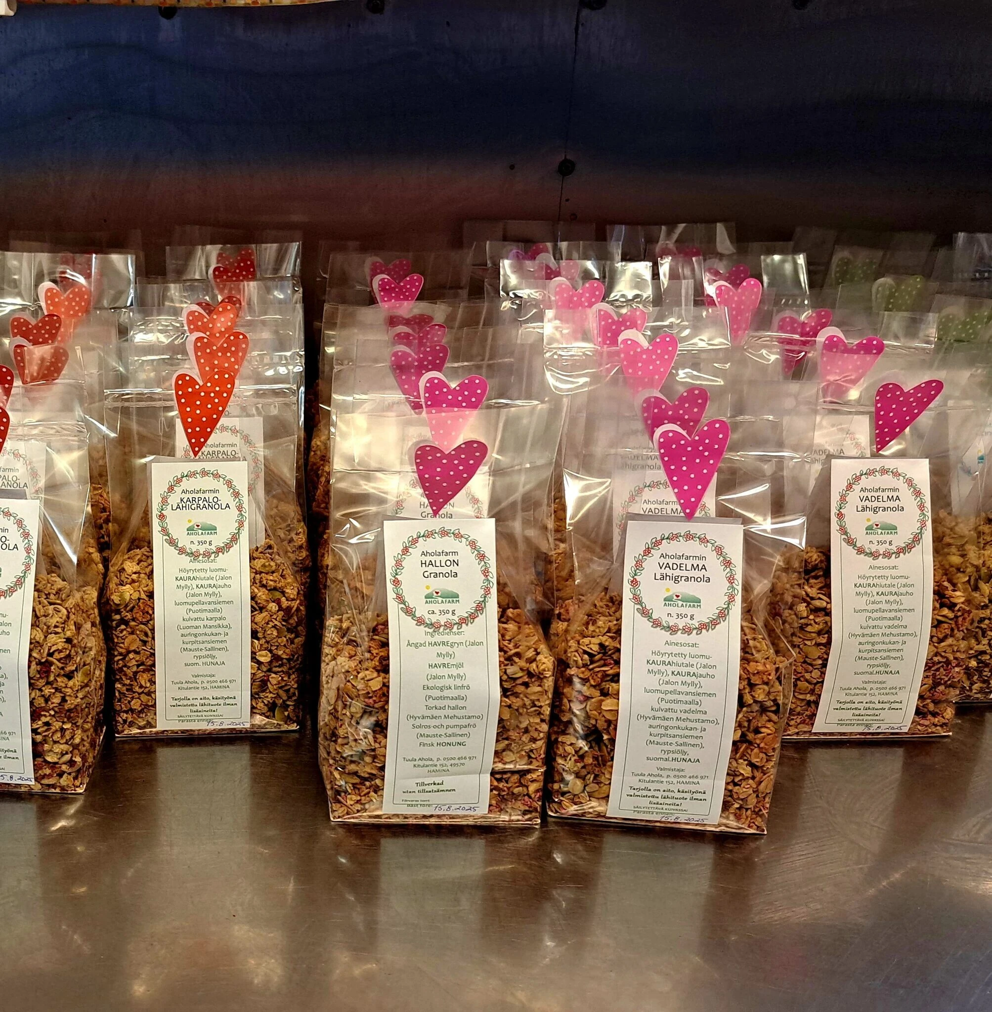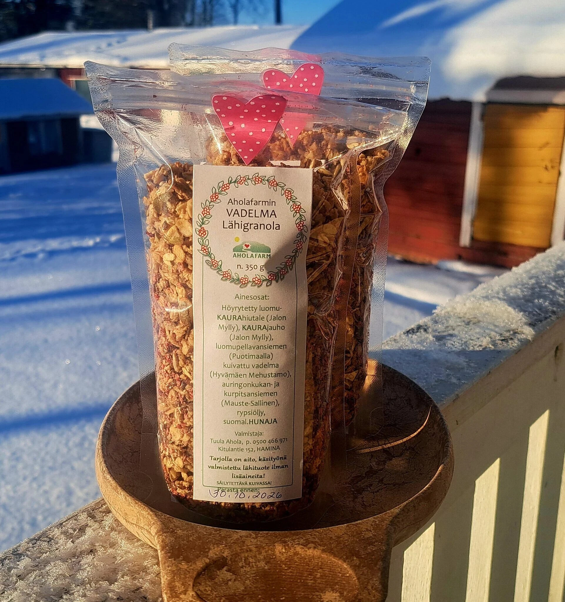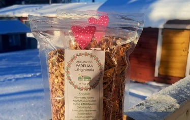 Vadelmagranola on lämminhenkinen sekoitus suomalaisia raaka‑aineita ja Aholafarmille ominaista käsityötä.