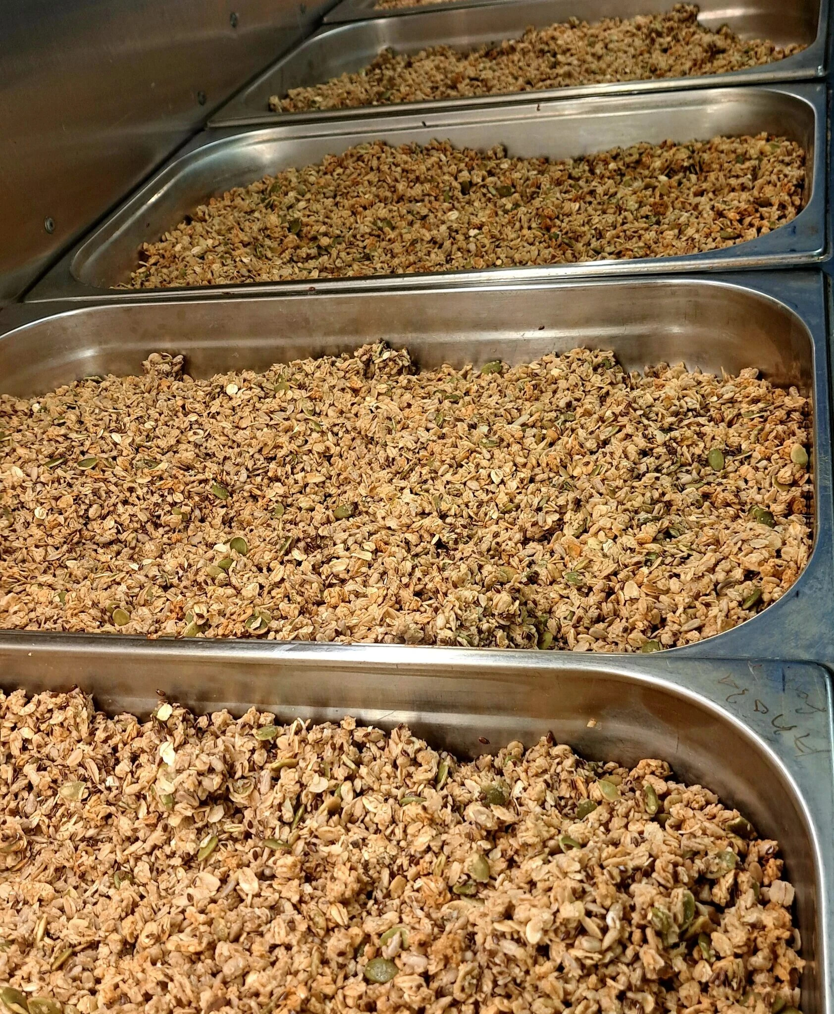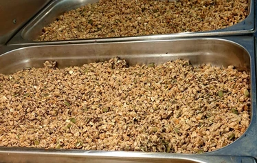 Paahdamme kauran ja siemenet pienissä erissä, jotta granola saa kauniin rapeuden ja paahteisen aromin.